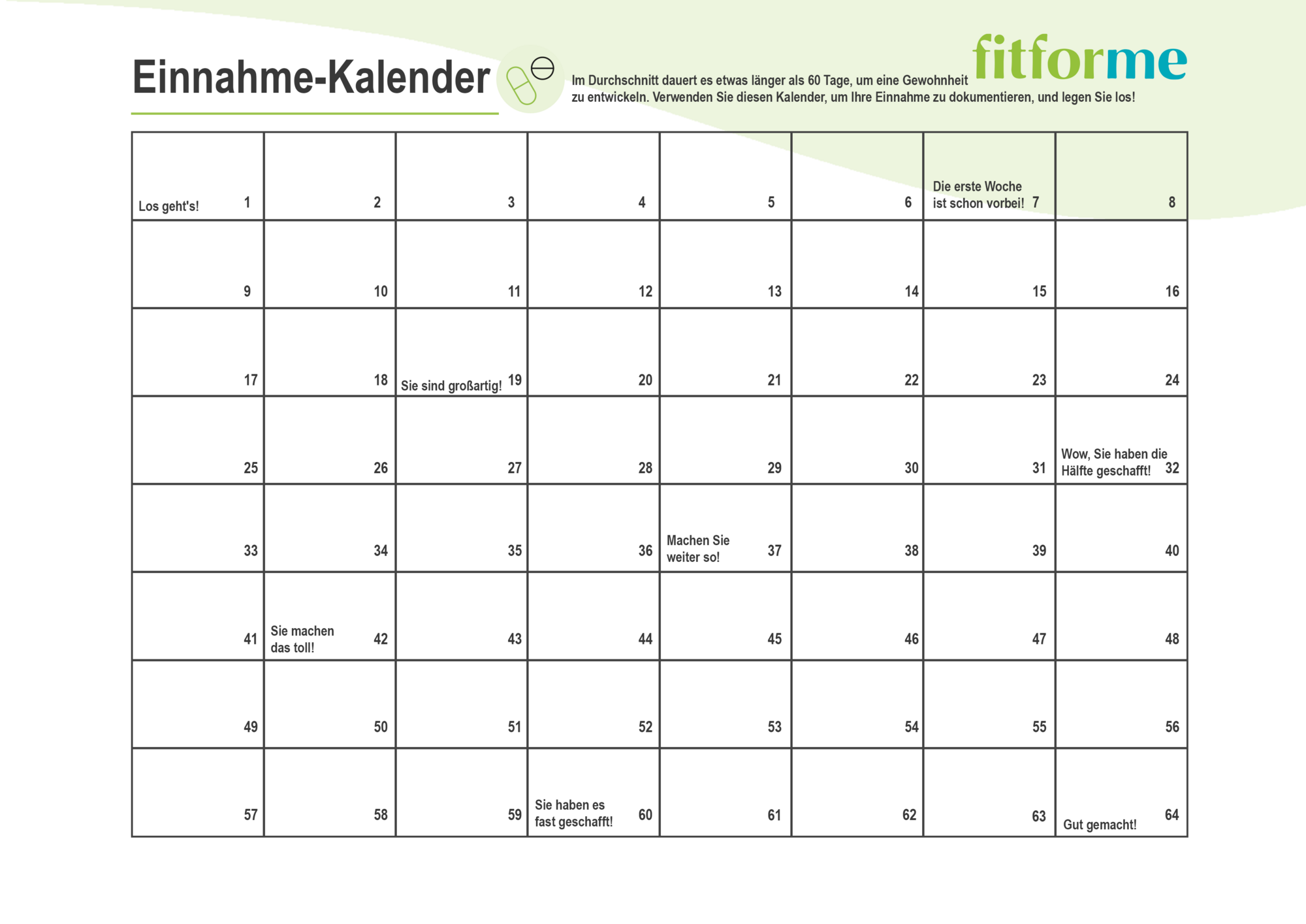 Sie können auch unseren Einnahme-Kalender ausdrucken und zum Beispiel an den Kühlschrank hängen.Nach der Einnahme Ihrer Vitamine setzen Sie einfach ein Kreuz beim jeweiligen Tag – so behalten Sie ganz leicht den Überblick.